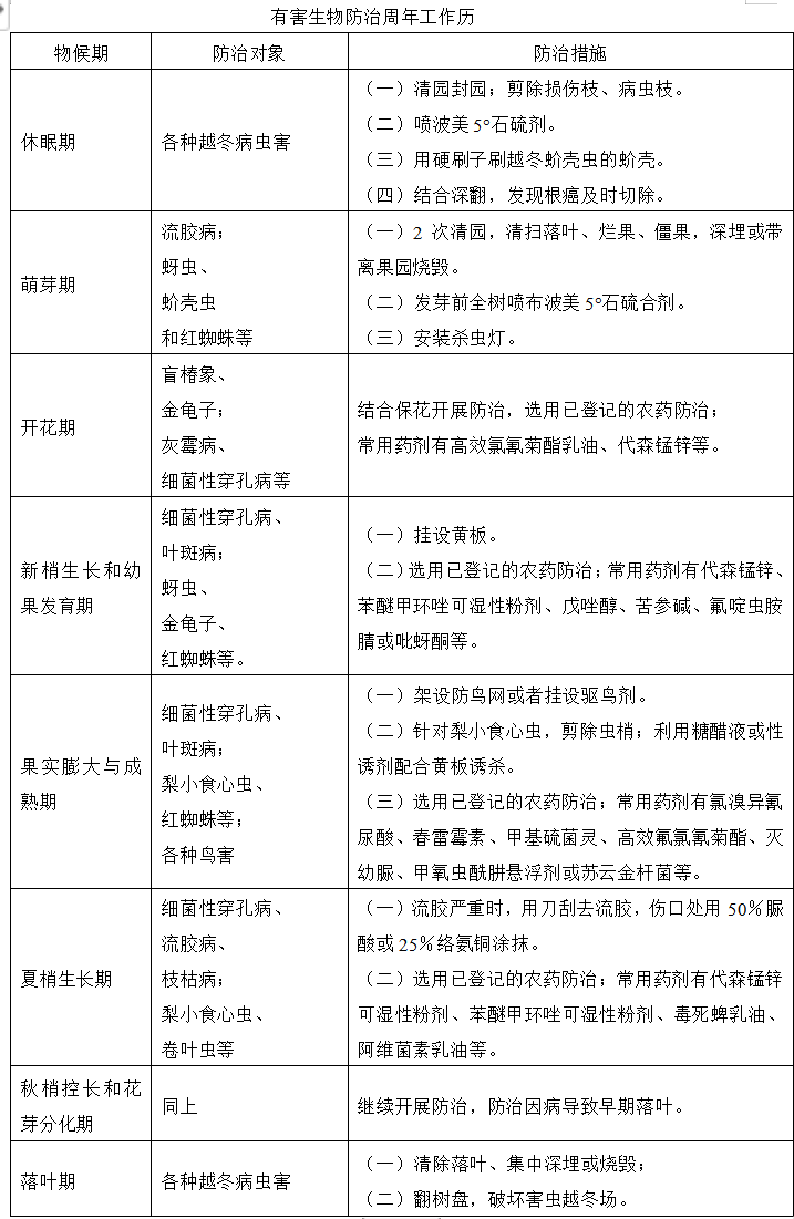 (一)园地选择 1地势地形 远离污染源,地形开阔。以坡度15°为界,坡度 15°以下的平地及缓坡地,适宜南北向栽植;大于15°的山地和丘陵地,适宜等高线延长行栽植。 避免在风口、山谷冷空气沉积地、低洼地建园。不宜重茬建园。 2气象条件 年平均气温12℃以上,3月上旬极端最低气温不低于-2℃,年平均降雨量600mm~1400mm,年日照1800~2800h。 3土壤条件 土层深厚,肥沃,有机质含量1.0左右,土壤pH值为6.0~7.5,地下水位在0.8m以下。 4排灌条件 要求有灌溉水源且不积涝。灌溉水条件应符合 NY/T5010-2016(无公害农产品种植业产地环境条件)。 (二)品种选择 以市场为导向,区域化和良种化为基础,适地适栽为原则。优先选用地方优良品种,适当搭配经过引种试验成功的外地优良品种。 避免选择易裂果品种。以山樱桃为砧木的红妃、黑珍珠、乌皮樱桃等为主栽品种。 成片建园,选择本地樱桃品种为授粉树,授粉品种配置最低不能少于10%,授粉品种与主栽品种花期应一致,或者比主栽品种早1~2d开花。 (三)定植 1苗木选择及处理 选择芽眼饱满的1年生优质嫁接苗。 壮苗标准:品种纯正,无杂苗,无检疫性病虫害,主根完好,侧根不少于3条, 嫁接口愈合良好,嫁接口以上1cm处的粗度在1.0cm 以上,苗高要求60cm以上。 定植前剪除根蘖、折伤的枝和根,对长30cm以上的根进行短截。栽前将苗木用多菌灵600倍液和ABT生根粉1000倍液泥浆浸根10~12分钟,促进苗木发根。 2园地整理 全园深翻,去大土块和杂树根等,将土块打碎、耙平。起垄挖定植沟,粘壤土坡地不能采用等高线起垄,略倾斜。垄宽视行距而定,沟深、下宽、上宽分别为0.6m × 0.6m × 0.8m。沟底铺15cm~20cm的秸秆。 每 667m2施1000kg~2000kg高品质有机肥,和挖出的土混合均匀后回填入沟中,新堆的土盘比地面高出20cm左右,灌水沉实。 3栽植密度 株行距应根据栽培模式确定,山地株行距3.0m×3.0m为宜,平地以1.5m×3.0m为宜。 4栽植 栽植的最佳时间应在冬季落叶后至春季萌芽时进行,即进行冬栽。时间以12月初至1月底为最佳。栽植时,在定植点挖小穴,将苗木放入穴内,舒展根系,扶正,填入细土,边填土边提苗,埋土深度与苗木根部原土痕相齐为宜,嫁接口露出土面,浇足定根水。在定植带盖黑地膜保墒,防虫、草害。 (四)土肥水管理 1土壤管理 每年一般翻耕2次,结合采后施肥,全园浅翻,深度为8cm~10cm,生长季中耕,秋施基肥,扩穴深翻,深度为20cm~30cm。 园地实施生草栽培或割草覆盖树盘。每年中耕除草2次,夏季6~7月割草压青,增加土壤水分和有机质;秋季9~10月铲除杂草,结合秋施基肥和深翻扩穴埋入底层。 2施肥管理 肥料应符合NY_T496—2010 (肥料合理使用准则通则)的要求。以施经腐熟无公害处理的有机肥为主,化肥为辅,保持或增加土壤肥力及土壤微生物活性。 3水份管理 中国樱桃根系分布较浅,既不抗旱,又不耐涝。重点是抓好萌芽前、硬核期、采后保叶时的土壤含水量,尤其在樱桃果实硬核期至第2次快速膨大期,要使10~30cm范围内的土壤含水量稳定在12%左右,以免影响果实膨大,防止裂果。 生长季节视墒情补水,灌水后田间持水量60%以上。果实转色后不宜浇水;高温干旱季节,田间持水量低于50%时应浇水灌溉。田间持水量大于80%时疏通排水沟,果园内不得有积水。 (五)整形修剪 1整形 根据栽培形式、立地条件、品种特性及管理要求的不同宜采用自然开心形和改良主干形。 自然开心形 干高50 cm,定植发枝后,在主干40cm~50 cm间选留不同方位、角度合适的3个生长健壮的枝条,作为主枝,主枝分枝角度在40°~70°之间,其余枝条去除。 每个主枝上配备开张角度70°左右的2个~3个侧枝,删除其它侧枝。树高控制在2.0m以内。 改良主干形 有中央领导干,干高180 cm,在整形带内选留12~15个错落着生的主枝,主枝基部与树干呈90°开张角度,分3层分布,第一层结果主枝长120cm,第二层80cm,第三层60cm,交错排列。 各主枝上每隔50~60cm,留2~3个侧枝。侧枝上配有结果枝组,也可用大型结果枝组代替侧枝。树高控制在1.8m以内。 2修剪 幼龄树修剪 幼树生长旺盛,主要以整形为主,尽快扩大树冠,培养牢固的骨架;对骨干枝、延长枝适度短截,对非骨干枝轻剪长放。 5月~7月份,对生长旺盛的主枝进行拉枝和摘心。 结果树修剪 盛果前期保持树势平衡,培养各种类型的结果枝组。要抑前促后,回缩更新,培养新的枝组,防止早衰和结果部位外移。结果枝组要不断更新。 应重视夏季修剪,果实采摘后立即进行修剪,也可以边采边剪。主要剪去当年的结果枝段。落叶后,剪去过密的夏梢,病残枝,并对过长的主枝和侧枝进行回缩。秋梢抽生时应作抹芽处理。 (六)花果管理 1控梢促花 在5月份~7月份对生长过旺的春、夏梢进行拉枝摘心;或在新梢长10cm~15cm时树冠喷施植物生长调节剂PBO200倍液~300倍液1~2次控梢。 2防裂果 果实转色期间,土壤含水量控制在50%~60%。果实膨大期喷施硝酸钙,行间生草,行内铺园艺地布。 (七)有害生物防治 以农业防治为基础,物理防治为核心,优先使用生物防治,按照病虫害的发生规律和经济阈值,科学使用化学防治技术,有效控制病虫危害。病害主要有干腐病、樱桃叶斑病、细菌性穿孔病、流胶病、根颈腐烂病等;虫害主要有蚜虫、桑白蚧、刺蛾、桃红颈天牛、苹果透翅蛾、红蜘蛛、金龟子、梨小食心虫等;鸟害有喜鹊、八哥、灰喜鹊等。 (八) 果实采收 采摘在果实八到九成熟时进行。分批采摘。做到“无伤采