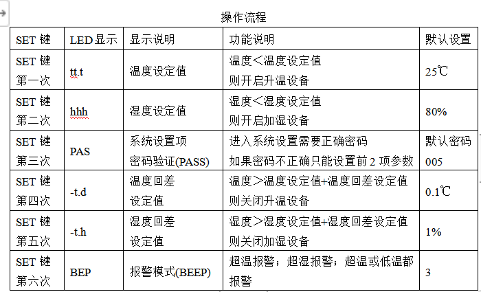 (一)系统组成 小蚕共育环境智能控制系统主要由环境智能控制箱、升温设备(升温板)、降温设备(空调)、补湿设备(超声波补湿器(包含补湿管网))、换气设备(换气扇)构成,具有温度、湿度、换气自动控制和温湿度适时显示功能。 1环境智能控制箱:主要由CYS-IV型蚕室环境智能控制仪,高精度温湿度传感器、固态继电器,空气开关等组成,每台套6kw。具有升温、降温、补湿、换气四种驱动控制功能,工作状态显示和液晶温、湿度实时显示共育房间的温、湿度值和换气状态。 2升温设备-电热升温板:由碳纤维升温线绕制而成,外面采用航空金属覆盖,4-6张/套,每个板80cm×90cm×4cm,功率0.8kw,其原理是在交变电场的作用下,发热体产生的热能以远红外辐射和对流的形式对外传递,电能与热能的转换率高达98%以上,3-5min即可达到设定温度。 3降温设备-空调:2台/套,3.5kw/台,壁挂式空调,冷暖电辅,定速,3级能效等级,制冷功率1085W,制冷量3530W。 4补湿设备-超声波补湿器:采用电子超频震荡(震荡频率为1.7MHz),通过雾化片的高频谐振,将水抛离水面而产生1-5μm的水颗粒形成自然飘逸的水雾,漂浮于空气中,提高空气相对湿度。设有低水位保护、水管电磁自动补水、溢水功能。每套2台,每台0.3kw。 补湿设备-立式分布可调式补湿管网:1套,是通过分布在共育室顶部的高分子PVC管将养蚕用超声波补湿器产生的湿气快速的输送到共育室的顶部,最后由PVC管上的分散式可调出口均匀排出,自上而下的弥漫整个共育室补湿。 5单向百叶窗换气扇:塑料单向风压的百叶窗换气扇,每套2-4个,每个0.04kw。 6性能参数。工作电源:AC380V,三相四线制 或AC220V。绝缘强度:IEC 60255-5 , 2KVrms-1mn。温度测量范围:-45℃~125℃,测量精度±0.5℃,分辨率:0.1℃。湿度测量范围:1%~100%,测量精度±3%,分辨率0.2% (二)匹配的标准共育室 每套小蚕共育环境智能控制系统匹配标准小蚕共育室技术参数 (三)参数设置与操作流程 1参数设置 通过“设置”键进行。长按“设置”键1秒以上,进入系统设置界面,在此界面每按“设置”键一次,分别设置换气、加热、制冷、补湿参数。设置完毕参数后,再长按“设置”键,退出。 2操作流程