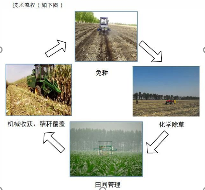 技术流程(如下图):秸科覆盖和免耕播种是这项技术关键环节。