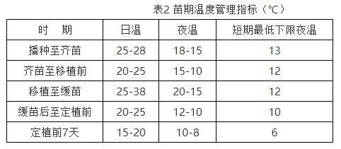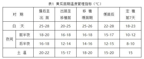 (3)水肥管理 苗期总体上以控水控肥为主。出苗后,降低温室内空气湿度,防止小苗徒长。移植缓苗后,控制浇水。幼苗3片真叶后,旱时选晴天上午浇透水,阴天不浇水。苗期一般不追肥,生长后期可用0.1 %磷酸二氢钾混入0.1 %尿素溶液进行叶面喷施。幼苗3叶期后,加大苗距,扩大营养面积。 (三)定植 1.棚室消毒 定植前要对棚室进行消毒,主要方法如下: (1)高温消毒 定植前清理干净前茬作物的残株烂叶以及杂草等,密闭棚室,保持棚室内较高的温度,利用太阳能对土壤高温消毒3 d以上,之后大通风。 (2)药剂熏蒸 定植前每亩用硫磺粉2-3kg、敌百虫0.5 kg,拌上锯末分多处点燃,密闭24h后通风排味。 2.整地施肥 棚室消毒后进行整地施肥。深松土壤,耙平整细,按大沟距(畦间行距)80-90 cm,小沟距(畦内行距)50cm开沟,做成宽窄行。结合整地作畦,施入腐熟有机肥作基肥,根据含氮量确定其施肥量,每亩施入有机肥的纯氮含量不低于11 kg,一般用硫酸钾,每亩施入15kg左右,有机肥2/3撒施、1/3沟施,化肥沟施。注意与葫芦科作物实行3年以上轮作。 3.定植 (1)定植时间 当10cm土温稳定在12 ℃以上,棚室内夜间最低气温不低于8 ℃时即可定植。保温条件好的日光温室在1月中下旬,越冬大棚加设二层幕和地膜覆盖可在4月初,单层大棚在4月中下旬定植。定植要选晴天进行。 (2)定植方法 定植沟可提前3-5 d开出晒土,提高地温,株距25-28 cm,每畦双行栽培,畦面上开沟,随水栽苗,穴施磷酸二铵作口肥,每株4 g左右。栽苗时覆土宜与幼苗土坨持平,表土半干后,中耕松土2-3次,由浅渐深,并在畦面中心开浅沟,向两侧培土,将畦面整理成马鞍状,畦上覆盖地膜。浇水时沿畦面中心开出的浅沟进行膜下暗灌。 (四)定植后管理 1.缓苗期 定植后重点是防寒保温,密闭温室或大棚,促进缓苗。必要时可在棚室外面加盖草帘子,棚室内设小拱棚进行保温,或利用火道、临时架设火炉、烟道进行人工加温。白天温度超过34 ℃通风。 2.缓苗后至根瓜坐住 温度控制在25 ℃左右,夜间12 ℃-15 ℃,不旱不浇水,也不追肥,以控制地上部生长,促进根系发育,一直到根瓜坐住时为止。 3.结瓜期 结瓜期可采取变温管理,温度调控指标见表2。