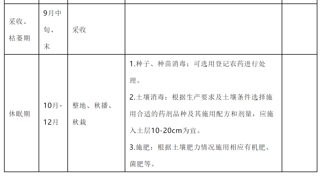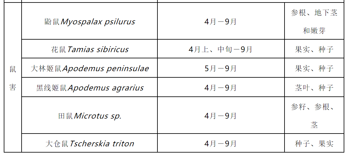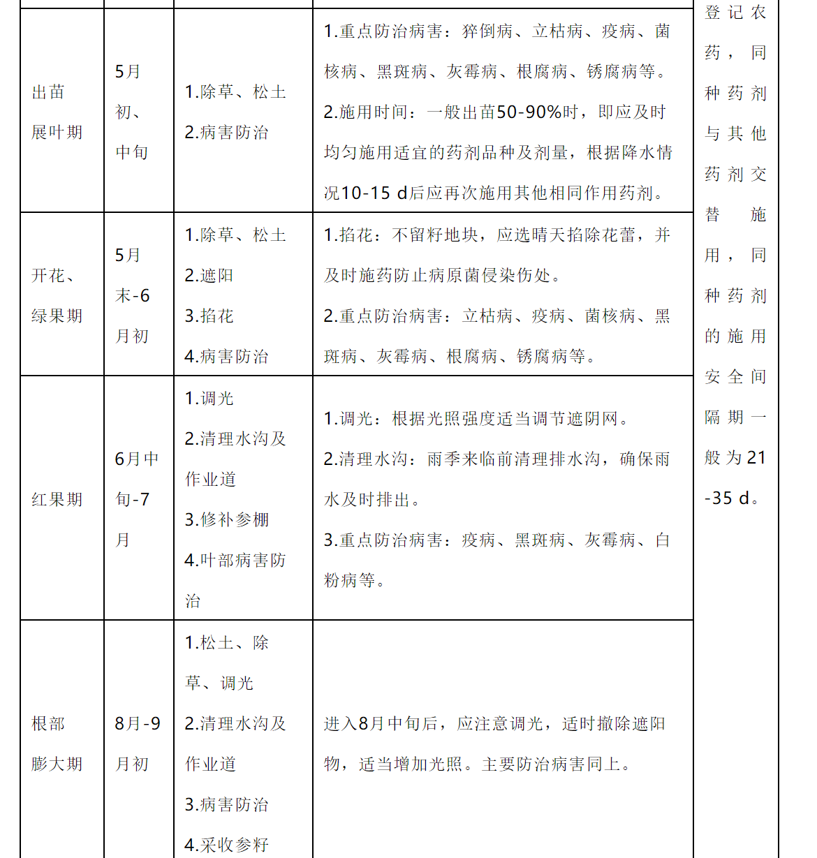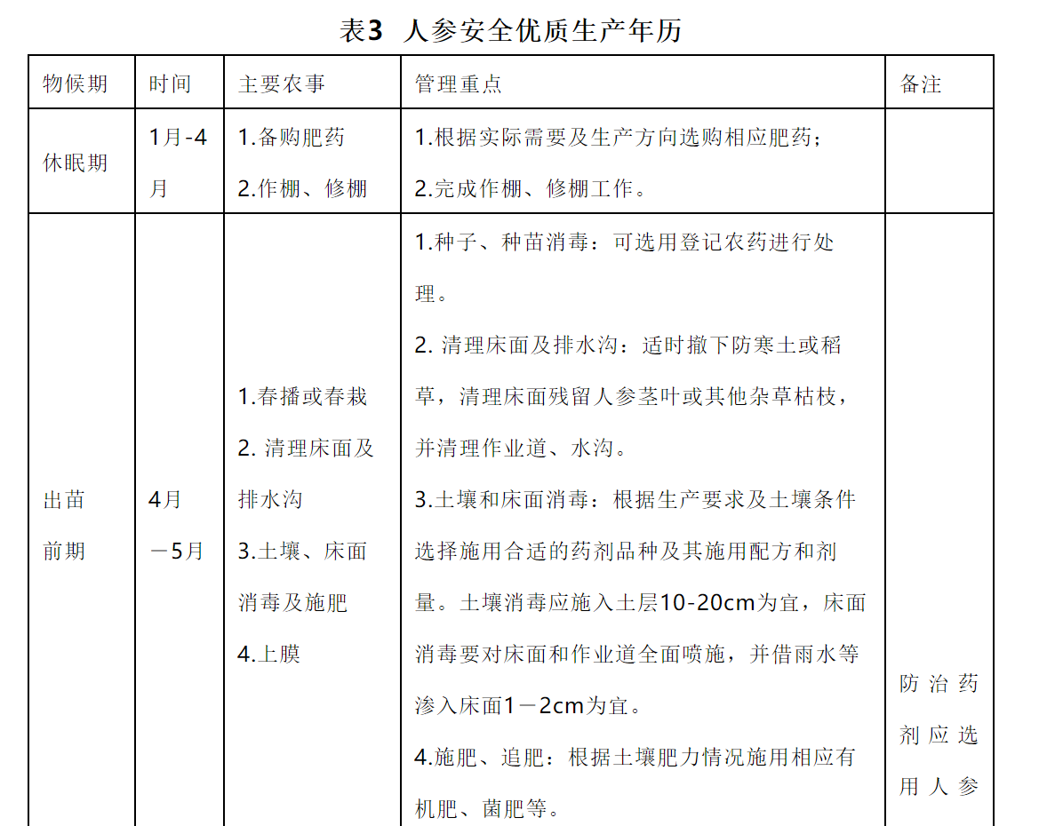 3.种子催芽处理 当年采收的种子应立即去除果肉洗净后进行催芽;上年采收的种子于6月初开始催芽。将种子与河沙(过孔径为0.17 mm 筛)按1:3混合均匀。温度在15 ℃-20 ℃为宜,每隔 10-15d 倒种一次,含水量 35 %-45 %为宜,催芽时间70-90d,催芽裂口率达95 %以上,胚率达80 %以上。达到催芽指标的种子,当年秋季不能播种时,应越冬贮藏。封冻前选择背阴高燥场地挖窖,窖底铺上木头或石块,种子箱放入窖内,箱口高出地面15 cm,箱顶覆盖编织膜,箱顶及周围培土30 cm,踏实。封冻后覆盖一层锯末或落叶,适量浇水,用帘子压好,第2年春季,解冻前取出播种。 (四)播种与移栽 1.播种 春播在4月中、下旬(土壤化冻后)开始,秋播在10月中旬到11月上旬(土壤结冻前)开始。 根据生产目的,可采用点播、条播或散播方式进行播种,直播株行距宜为(3-5 cm)×(15-18 cm),育苗株行距宜为(3 -5 cm)×(5-8 cm)。 春播覆土3-6 cm为宜,根据生产需要可覆盖已进行消毒处理的碎稻草、碎玉米秸秆或树叶,应边播种边覆盖,以防干旱。秋播覆土4-6 cm为宜,根据生产需要可覆盖已进行消毒处理的碎稻草、碎玉米秸秆或树叶等防寒物3-8 cm。 2.移栽 春栽在4月中、下旬(土壤化冻后,芽孢萌动前)进行,秋栽在10月中旬到11月上旬(土壤结冻前)进行。斜栽或平栽,株行距一般为(8-15 cm)×(18-30 cm)。 (五)田间管理 1.出苗前期管理 每年的4月(不同地区时间略有不同)是人参播种前期准备的阶段。主要进行床面和排水沟清理、床面消毒、松土、春播春栽和施肥及参膜覆盖等工作。控制土壤湿度和消灭病害传染源,预防极端天气造成的缓阳冻、大风等气候灾害。 出苗前期主要发生人参(西洋参)根部病害,如:菌核病、根腐病等,适宜土壤湿度和温度是预防根部病害的关键。提前预防茎部病害,如:茎部黑斑病、灰霉病、疫病等。 根据人参(西洋参)年生、田间状况及生产要求选择适宜的消毒药剂。将田间植株茎叶残骸及时彻底清除,集中销毁,并及时采用合适药剂对床面及作业道全面消毒。施用药剂应选择人参登记农药,防治病害应做到净、狠、全。 2.出苗展叶期的田间管理 每年的4月-5月中旬是人参(西洋参)的出苗展叶期,在前期准备的基础上,应及时观察气候变化,进行必要的预防措施。调整光照强度,除草,预防病害发生,特别防治颈部病害的发生,如:黑斑病、立枯病、疫病等,不留籽地块进行摘蕾处理。 应根据人参生长时期的适宜光照进行调光,1年生苗田和留种田应上薄膜和遮阳网,透光率30 %左右,其他年生苗田只上膜,透光率40 %-50 %。 一般移栽地块易发生茎部黑斑病,新移栽、新播及二年苗地块易发生立枯病。 3.开花结果期管理 每年5月中旬到8月初是人参的开花结果期。调整光照强度,除草,预防病害发生,特别防治黑斑病和灰霉病等病害的发生,果实采收。 应根据人参生长时期的适宜光照进行调光,1年生苗田和留种田应上第二层遮阳网,透光率20 %左右;其他年生苗田上第一层遮阴网,透光率30 %-40 %,开花期应及时上第二层遮阴网,透光率20 %-25 %。 暴热天气后易爆发黑斑病,部分通风不畅,低洼冷凉、长期潮湿地块,易发生灰霉病。 4.根部膨大期及采收期管理 每年8月中旬-9月中旬是人参的根部膨大期和采收期,西洋参为8月中旬-10月中旬。调整光照强度和土壤湿度,除草,追肥,预防病害发生,特别防治黑斑病和灰霉病等病害的发生,人参采收。 应根据人参生长时期的适宜光照进行调光和调水,撤掉第二层遮阳网,适当增加光照,透光率40 %-50 %。进入雨季后降水集中,应及时清理排水沟防止参床积水过雨,参床土壤湿度过大可以引发人参根部病害的发生。对当年作货的地块,可适当撤膜放雨,增加土壤湿度,干旱严重的应适当浇水2-3次。 人参叶部病害的发病盛期,一般以黑斑病、灰霉病为主,也是疫病的主要发病时期。如持续晴热,黑斑病易流行发生;如持续阴雨低温,灰霉病易流行发生;如持续高温高湿,疫病易流行发生。 5. 农药选择及施用方法 根据防治目标及药剂配方选定所需药剂(人参登记农药)。同种药剂与其他药剂交替施用,同种药剂的施用安全间隔期一般为21-35 d。做货地块应严格控制最后一次施药到收获时的安全间隔期。表3