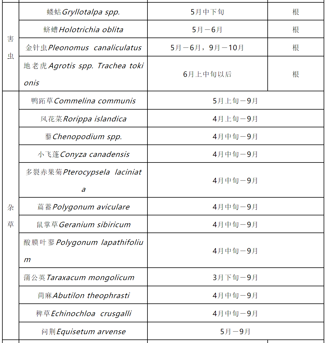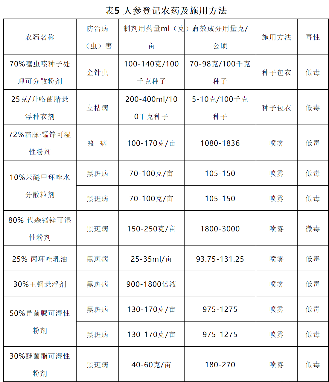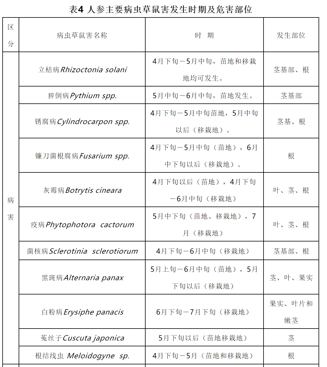 3.种子催芽处理 当年采收的种子应立即去除果肉洗净后进行催芽;上年采收的种子于6月初开始催芽。将种子与河沙(过孔径为0.17 mm 筛)按1:3混合均匀。温度在15 ℃-20 ℃为宜,每隔 10-15d 倒种一次,含水量 35 %-45 %为宜,催芽时间70-90d,催芽裂口率达95 %以上,胚率达80 %以上。达到催芽指标的种子,当年秋季不能播种时,应越冬贮藏。封冻前选择背阴高燥场地挖窖,窖底铺上木头或石块,种子箱放入窖内,箱口高出地面15 cm,箱顶覆盖编织膜,箱顶及周围培土30 cm,踏实。封冻后覆盖一层锯末或落叶,适量浇水,用帘子压好,第2年春季,解冻前取出播种。 (四)播种与移栽 1.播种 春播在4月中、下旬(土壤化冻后)开始,秋播在10月中旬到11月上旬(土壤结冻前)开始。 根据生产目的,可采用点播、条播或散播方式进行播种,直播株行距宜为(3-5 cm)×(15-18 cm),育苗株行距宜为(3 -5 cm)×(5-8 cm)。 春播覆土3-6 cm为宜,根据生产需要可覆盖已进行消毒处理的碎稻草、碎玉米秸秆或树叶,应边播种边覆盖,以防干旱。秋播覆土4-6 cm为宜,根据生产需要可覆盖已进行消毒处理的碎稻草、碎玉米秸秆或树叶等防寒物3-8 cm。 2.移栽 春栽在4月中、下旬(土壤化冻后,芽孢萌动前)进行,秋栽在10月中旬到11月上旬(土壤结冻前)进行。斜栽或平栽,株行距一般为(8-15 cm)×(18-30 cm)。 (五)田间管理 1.出苗前期管理 每年的4月(不同地区时间略有不同)是人参播种前期准备的阶段。主要进行床面和排水沟清理、床面消毒、松土、春播春栽和施肥及参膜覆盖等工作。控制土壤湿度和消灭病害传染源,预防极端天气造成的缓阳冻、大风等气候灾害。 出苗前期主要发生人参(西洋参)根部病害,如:菌核病、根腐病等,适宜土壤湿度和温度是预防根部病害的关键。提前预防茎部病害,如:茎部黑斑病、灰霉病、疫病等。 根据人参(西洋参)年生、田间状况及生产要求选择适宜的消毒药剂。将田间植株茎叶残骸及时彻底清除,集中销毁,并及时采用合适药剂对床面及作业道全面消毒。施用药剂应选择人参登记农药,防治病害应做到净、狠、全。 2.出苗展叶期的田间管理 每年的4月-5月中旬是人参(西洋参)的出苗展叶期,在前期准备的基础上,应及时观察气候变化,进行必要的预防措施。调整光照强度,除草,预防病害发生,特别防治颈部病害的发生,如:黑斑病、立枯病、疫病等,不留籽地块进行摘蕾处理。 应根据人参生长时期的适宜光照进行调光,1年生苗田和留种田应上薄膜和遮阳网,透光率30 %左右,其他年生苗田只上膜,透光率40 %-50 %。 一般移栽地块易发生茎部黑斑病,新移栽、新播及二年苗地块易发生立枯病。 3.开花结果期管理 每年5月中旬到8月初是人参的开花结果期。调整光照强度,除草,预防病害发生,特别防治黑斑病和灰霉病等病害的发生,果实采收。 应根据人参生长时期的适宜光照进行调光,1年生苗田和留种田应上第二层遮阳网,透光率20 %左右;其他年生苗田上第一层遮阴网,透光率30 %-40 %,开花期应及时上第二层遮阴网,透光率20 %-25 %。 暴热天气后易爆发黑斑病,部分通风不畅,低洼冷凉、长期潮湿地块,易发生灰霉病。 4.根部膨大期及采收期管理 每年8月中旬-9月中旬是人参的根部膨大期和采收期,西洋参为8月中旬-10月中旬。调整光照强度和土壤湿度,除草,追肥,预防病害发生,特别防治黑斑病和灰霉病等病害的发生,人参采收。 应根据人参生长时期的适宜光照进行调光和调水,撤掉第二层遮阳网,适当增加光照,透光率40 %-50 %。进入雨季后降水集中,应及时清理排水沟防止参床积水过雨,参床土壤湿度过大可以引发人参根部病害的发生。对当年作货的地块,可适当撤膜放雨,增加土壤湿度,干旱严重的应适当浇水2-3次。 人参叶部病害的发病盛期,一般以黑斑病、灰霉病为主,也是疫病的主要发病时期。如持续晴热,黑斑病易流行发生;如持续阴雨低温,灰霉病易流行发生;如持续高温高湿,疫病易流行发生。 5. 农药选择及施用方法 根据防治目标及药剂配方选定所需药剂(人参登记农药)。同种药剂与其他药剂交替施用,同种药剂的施用安全间隔期一般为21-35 d。做货地块应严格控制最后一次施药到收获时的安全间隔期。表3