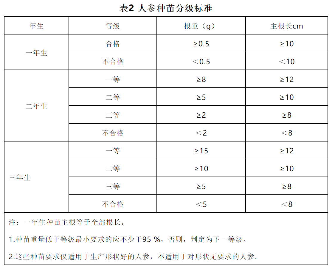 2.选苗 合格种苗应满足以下要求:种苗的主根、侧根、须根应完整.主根应饱满、质地充实,人参种苗越冬芽应完整,饱满,质地充实,不应检出镰刀菌、链格孢及线虫。种苗重量应满足表2要求。