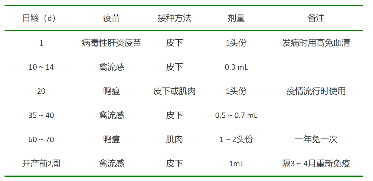 7.疫病防控:蛋鸭上笼前完成所有免疫,表2是推荐的笼养蛋鸭免疫程序,并做好定期消毒驱虫工作。 表2蛋鸭免疫程序
