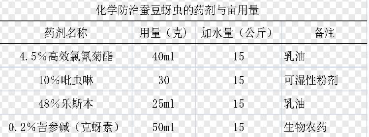 <p>(一)危害特征与发生 蚕豆苜蓿蚜群集于蚕豆嫩茎、嫩梢、顶芽和花骨朵等处,刺吸汁液,致使顶芽不能正常生长,嫩梢萎缩,生长受阻,植株矮化。 不同蚕豆地区均有发生。 (二)防治技术 1、农业防治 (1)拔除有虫植株、摘除受害嫩梢:在蚜虫发生初期,拔除有虫株深埋,阻止扩散;(2)铲除越冬寄主,在深秋或早春铲除田边地埂杂草并烧毁,可减少越冬虫卵或刚孵化的若蚜。 2、化学防治 1 防治时期 蚕豆盛花期,田间蚜株率达10%~15%,株蚜量大于5头时即进行防治。 2 药剂选择与用量(见图)
