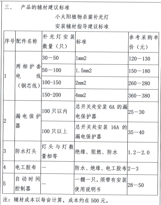 <p>(一)补光灯分类(小太阳杀菌补光灯) 针对各类植物的习性和对光的不同需求分类为: 1.果蔬类杀菌补光灯:应用于果实类蔬菜,如黄瓜、西红柿、茄子、丝瓜、西葫芦、辣椒等; 2.瓜果类杀菌补光灯:应用于水果类,如草莓、油桃、樱桃、西瓜、葡萄等; 3.育苗类杀菌补光灯:应用于各类种苗、组培苗 (二)补光灯的安装使用方法 1.根据每只灯最佳辐射面积10平方,标准安装每亩66只。 2.必须使用防水灯头、自动时间控制器、漏电保护器。 3.安装灯头电线需预留一定长度(1.5米),以便于随着植株的生长而及时灵活调整补光灯高度。 4.安装高度根据作物不同,确保距离植物0.5~0.8米,间距为3~3.5米。 5.根据植物的不同生长阶段和当地的光照条件,每天确保作物充分光照,不足部分以早晚两次补光时间控制来实现(时间控制器设置),如晴天补光4-5小时,阴雨雪天等恶劣天气时,全天补光12-14小时。 备注:植物可以根据光周期特性分为: ①长日照植物:每天的光照时间13~16小时才能形成健壮植株。 (如西红柿、黄瓜、油菜、菠菜等) ②短日照植物:每天光照时间为8~12小时即可。(如菊花、水稻、大豆等) ③中间性植物:对光照长短没有严格要求,只要其他生态条件合适。(如丝瓜、四季豆、番薯等) (三)产品的辅材建议标准
