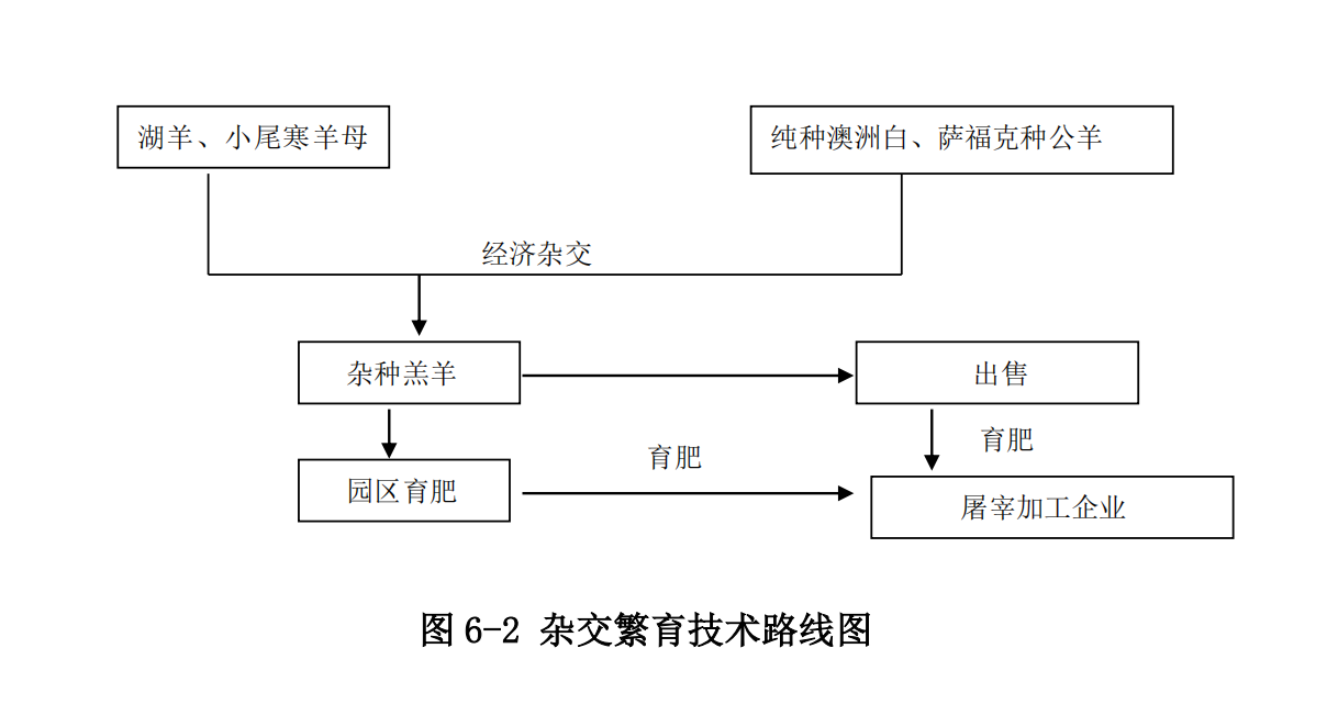 (一)、肉用种羊纯种繁育和杂交利用推广 1、品种品种选择澳洲白、萨福克肉羊,繁育方法采用本品种繁育和级进杂交。澳洲白绵羊是国外专门化粗毛型肉羊品种的最新成果,2009 年在澳大利亚注册为品种(INC9892274),2011 年 3 月正式在澳大利亚上市。该品种集成了白杜泊绵羊,万瑞绵羊,无角道赛特绵羊和特克赛尔绵羊品种基因,通过对多个品种羊特定肌肉生长基因标记和抗寄生虫基因标记的选择(MyoMAX, LoinMAX, WormSTAR) 培育而成。澳洲白绵羊是继杜泊绵羊之后、中国引进的第二个专门化肉羊品种,不仅适合与中国不同地区的绵羊品种进行直接杂交,也可以配套杜泊绵羊,与中国不同地区的绵羊进行三元杂交生产优质肉羊。澳洲白绵羊的中、大体型和生长速度快的特点,使之成为专门化肉羊三元杂交组合的终端父本,也是开展新品种选育和配套系选育的关键品种。 萨福克羊产于英国英格兰东南的萨福克、诺福克、剑桥和艾赛克斯等地,是世界公认的用于终端杂交的优良父本品种。该品种体大、骨骼坚强、早熟,生长发育快、产肉性能好。3 个月龄羔羊胴体重达 17 公斤,肉嫩脂少。因早熟、产肉性能好,在英国、美国用作肥羔生产的终端品种。湖羊:由蒙古羊选育而成。具短脂尾型特征,公、母羊均无角,体躯长,四肢高,毛色洁白,脂尾扁圆形,不超过飞节。终年繁殖。小母羊 4~5月龄性成熟,营养良好的情况下可两年产 3 胎,每胎产羔 2~3 只。泌乳量多,羔羊生长发育快,三月龄断奶体重公羔 25 公斤以上,母羔 22 公斤以上。成年羊体重公羊 65 公斤以上,母羊 40 公斤以上。屠宰后净肉率 38%左右。。成年羊每年春、秋剪毛两次。 湖羊在太湖平原经过长期驯养,适应性强、生长快、成熟早、繁殖率高。 小尾寒羊:属蒙古羊系,早熟、多胎、多羔,四季发情,繁殖力强,遗传性稳定等特性。6 月龄即可配种受胎,年产 2 胎,胎产 2~6 只。早期生长发育快,体格高大,4 月龄即可育肥出栏。肉质细嫩,肌间脂肪呈大理石纹状,肥瘦适度,鲜美多汁,肥而不腻,鲜而不膻。而且营养丰富,蛋白质含量高,胆固醇含量低,富含人体必需的各种氨基酸、维生素、矿物质元素等。 澳洲白羊、萨福克羊作为优良的肉羊品种,在国际国内市场颇受欢迎。与国内地方品种杂交,在相同的饲养管理条件下,杂种羔羊具有明显的肉用体型。利用这种方式进行专门化的羊肉生产,羔羊当年即可出栏屠宰,使羊肉生产水平和效率显著提高。拉动畜牧业的发展,就是为了提高畜牧业的经济效益,增加牧民收入。 2、技术路线