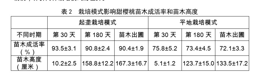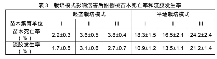注: Ⅰ: 烟台市福山区义明园艺场;Ⅱ:烟台市莱阳绿旺樱桃合作社;Ⅲ:烟台市<br /> 北方果业园艺场<br /> 该结果表明,采用起垄栽培模式,明显降低了甜樱桃苗木死亡率和流胶发生率,<br /> 分析主要原因是由于采用地膜覆盖后,外界降雨不容易进入土壤,多余水分从行间及<br /> 时排出,减轻了涝害影响。</p>