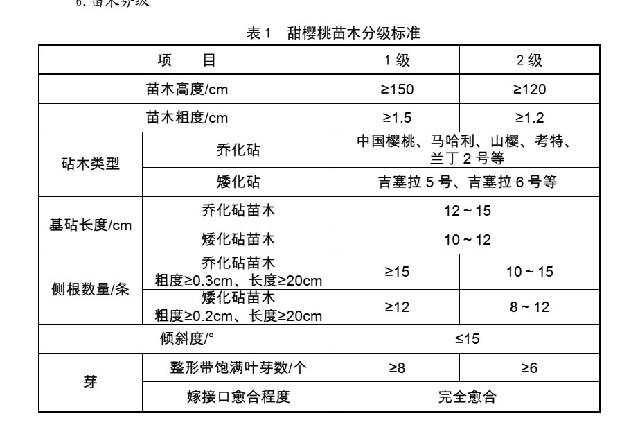 <p>甜樱桃集约化育苗技术主要由起垄栽植、微喷管铺设、覆盖防草地膜、苗木田间<br /> 综合管理、苗木出圃及苗木分级五大部分构成。<br /> 1.起垄栽植<br /> 1.1 规范起垄<br /> 采用机械起垄,垄高 20-25 厘米,垄距 75-80 厘米,垄面宽 20 厘米。<br /> 1.2 栽植砧木<br /> 采用人工栽植,株距 12-15 厘米,栽植深度 8-10 厘米。<br /> 2.微喷管铺设<br /> 在垄面放置 PE 微喷管,使出水孔朝上,每行设置一个控水阀门。 PE 微喷管的<br /> 规格为直径 4 厘米,斜 5 孔,孔径 0.3 毫米。<br /> 3.覆盖防草地膜<br /> 采用具有防草功能的黑色地膜,地膜宽度 100 厘米,厚度 0.006 毫米,在砧木苗<br /> 两侧均覆盖地膜,且有 10-15 厘米的交叉重叠部分。<br /> 4.苗木田间综合管理<br /> 4.1 嫁接前砧木管理: 砧木栽植后立即浇水,第一遍需水量大,间隔 7 天进行第<br /> 二次浇水, 15 天后可进行品种嫁接。<br /> 4.2 苗木生长前期管理: 这时期约为 30 天,从开始嫁接至接芽生长约 15 厘米,<br /> 间隔 10 天浇水一次,保证土壤含水量适宜。为防止苗木受金龟子和象鼻虫危害, 可<br /> 喷布 90%敌百虫 1000 倍液。4.3 苗木生长中期管理: 这时期约为 150 天,是苗木快速生长的时期。间隔 10<br /> 天浇水一次,间隔 30 天随水施用优质冲施肥(氮素为主)一次。从 6 月中下旬开始<br /> 防治病虫害的药剂种类及浓度为 50%多· 锰锌 600-800 倍+ 30%桃小灵 1000-1500<br /> 倍防治叶斑病和梨小食心虫(俗称“折梢虫”),。间隔 15-20 天一遍,连喷 3 遍,以后<br /> 再单喷 2-3 遍 50%多· 锰锌,全年喷药 5-6 次。<br /> 4.4 苗木生长后期管理: 这时期约为 40 天,为防止苗木贪青徒长,应停止地面肥<br /> 料和水分的供给,以促进苗木充分木质化,保证苗木安全越冬。在 10 月底至 11 月初,<br /> 叶面喷施尿素浓度为 3%~ 5%,促进叶片脱落,还可增加苗木的贮藏营养。<br /> 5.苗木出圃<br /> 山东地区,一般于 11 月中旬开始出圃。起苗时使用专业起苗设备,不要损伤苗<br /> 木皮层和芽眼,尽量保持根系完整。<br /> 6.苗木分级