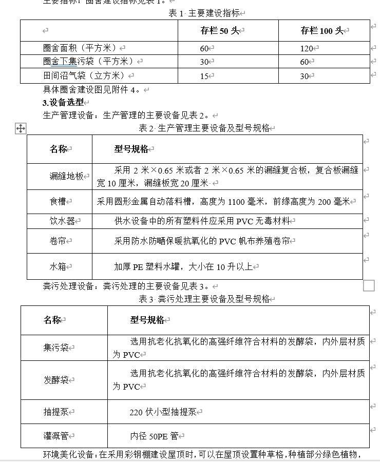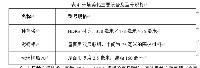 具体圈舍建设图见附件4。 3.设备选型 生产管理设备:生产管理的主要设备见表2。粪污处理设备:粪污处理的主要设备见表3。 表3 粪污处理主要设备及型号规格环境美化设备:在采用彩钢棚建设屋顶时,可以在屋顶设置种草格,种植部分绿色植物,在起到美化环境的同时也可起到隔热降温的作用。也可以在选用琉璃树脂瓦等材料进行装饰。环境美化的主要设备见表4。