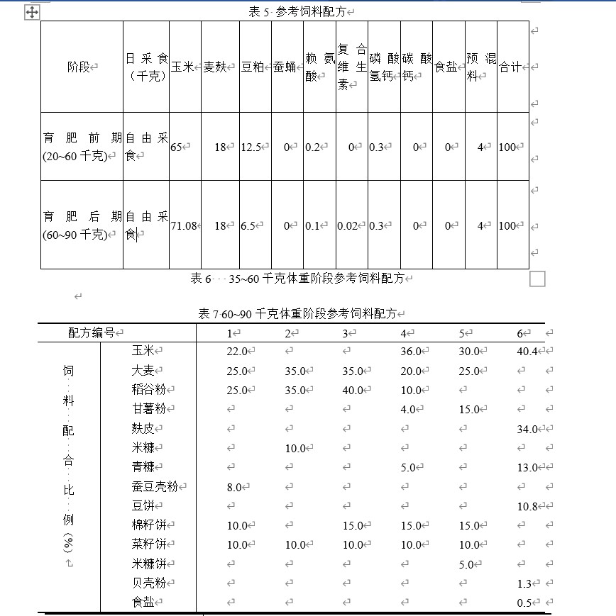 表4 环境美化主要设备及型号规格(二)品种选择技术。存栏 50头、 100头规模的商品猪场,宜选用地方猪育肥或含有地方猪血缘的土杂商品猪育肥。此类猪在市场上价格较高且价格浮动较小,能保障养殖户的收益。 我国地方猪种约有几十个,这些猪种产仔数多少不等,出生体重小,育肥期通常需要 8个月或更长的时间,因此存在生长速度慢、瘦肉率低、饲料转化率低等缺点,但因其繁殖率高、肉质好、适应性能较强、耐粗饲、抗逆性强等优良特性得到积极广泛的利用。 (三)饲料配制技术。“公司+养殖户”的经营模式,一般龙头企业统一饲料配送给养殖户进行商品肉猪养殖。养殖户如需自配饲料,以下介绍几种常用的商品育肥猪饲料配方供参考。 表5 参考饲料配方
