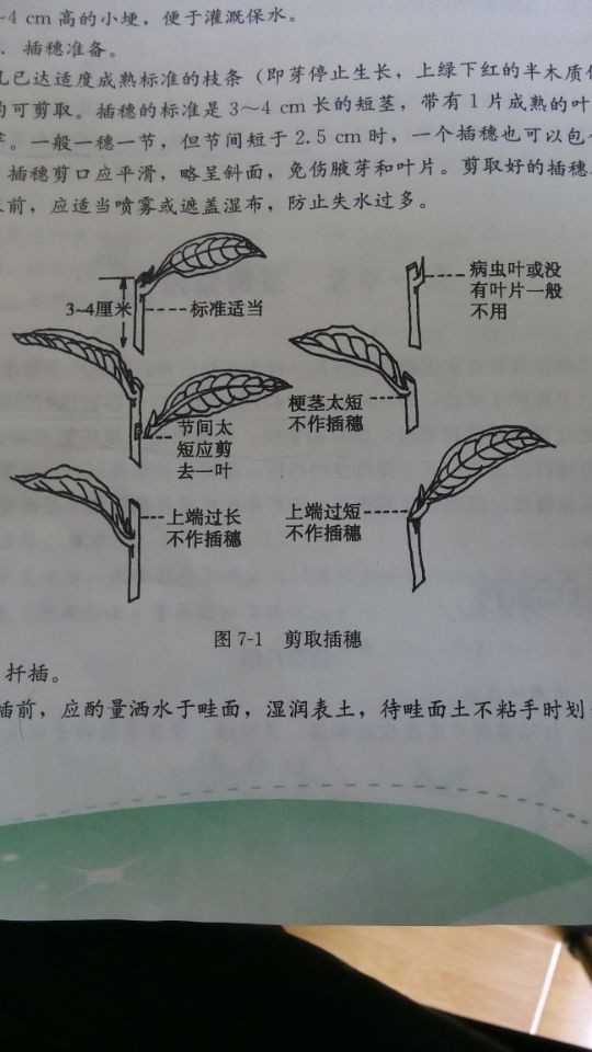 图3 穗条标准 3 扦插技术要求 扦插前将苗床充分喷湿,待表土不粘手时再按茶树叶片长度划线,一般插穗行距8-10cm,株距2-3cm。以叶片不重叠为宜,用拇指、食指和中指捏住插穗叶片下部将插穗直插或稍斜插入土中,深度以露出叶柄为宜,叶片顺风且叶片朝向一致,边插边将土壤稍加压实,使插穗与土壤紧贴以利发根。扦插时,剪下的穗条尽快存放于阴凉处,做到当时剪,当天插完,以保持插穗的新鲜。扦插前可将剪好的穗条放入稀释500倍的ATP生根粉溶液中浸泡2小时,可提高穗条成活率。