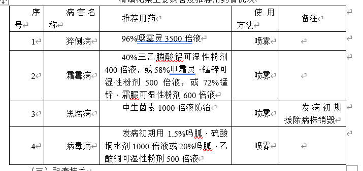 (二)花菜栽培技术 1 品种选择 选择耐寒、抗病性强、生育期80-120d、产量高的杂交一代中晚熟品种。 2 整地与施肥 2.1整地 在西红柿采收完成后,清除杂草,翻耕整地,使土质疏松,田块平整,肥力均匀。 2.2施肥 按 NY/T 394 规定执行。以施用有机肥或生物有机肥为主,不使用工业废弃物、城市垃圾和污泥。不使用未经发酵腐熟、未达到无害化指标、重金属超标的人畜粪尿等有机肥料。结合整地,每667m²施腐熟的优质农家肥2500-3000kg,复合肥50kg,硼砂1.5kg。 3 育苗 3.1苗床选择:苗床选择地势较高,水源条件好,肥沃疏松,有机质含量高的田块。 3.2播种育苗:播种前土壤进行翻耕后,施入优质腐熟的农家肥,平整作厢,于 9月中下旬采用穴盘精量播种育苗,出苗后视床土干湿,用洒水壶浇水,覆盖0.5cm培养土护芽,苗子长出真叶后,用0.2%磷酸二氢钾喷雾一次。 4 定植 青花菜在1.2m(含沟宽)的厢面上栽两行,株行距50×60cm,每667m²栽2000株左右;白花菜在1.1m(含沟宽)的厢面上栽两行,株行距46×50cm,每667m²种2200株左右。定植后及时浇定根水,以后注意淋水直到成活。 5、田间管理 定植后7-10天,用腐熟人粪尿(或沼液)加少许尿素提苗。莲座期每667㎡施尿素15kg,过磷酸钙7kg,硫酸钾3kg。始现蕾时在植株周围兑水穴施尿素10-13kg/667㎡。用磷酸二氢钾50g、硼砂50g和硫酸镁200g兑水15kg,于现蕾前及花球直径5-6cm时各喷一次,可促进蕾球膨大。其中青花菜主蕾收后,可以结合灌水每667㎡施尿素10kg加硫酸钾3kg,促进侧蕾发育。在花菜生育期内,每667㎡施用纯氮量不要超过18kg(折合尿素39kg)。保持土壤湿润,第一次追肥后中耕除草一次,并进行培土,生长后期停止中耕。 6 采收 花菜的适收期为花球已发育至品种固有的大小,青花菜小花蕾(白花菜球状小花枝顶端)尚未松开之前,表面平滑,花球紧实。要每天采收,不宜中断。花菜的适收期很短,尤其遇到气温上升至25℃以上时,花球老化迅速,所以必须及时采收。采收时间宜选择在一天中气温较低时,不要冒雨采收。采收前停止施用氮素化肥,严格执行农药安全间隔期。 7 病虫害防治 7.1农业防治:与非十字花科作物实行3年以上轮作;选用抗病、耐病、抗蚜品种;高畦窄厢栽培,施用生物菌肥或腐熟有机肥作底肥,合理追肥。 7.2物理防治:可降解色板诱蚜诱绳诱粉虱,银灰色地膜覆盖避蚜。 7.3生物防治:合理用药,保护天敌。 7.4化学防治:合理用药:按照NY/T 393《绿色食品 农药使用准则》合理使用农药。禁止使用国家明令禁止的高毒、剧毒、高残留的农药及其混配农药品种。在使用化学农药时,选用低毒低残留农药,合理混用、轮换、交替用药,防止和推迟病虫害抗性的产生和发展。 清镇花菜主要病害及推荐用药情况表
