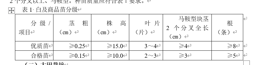 (一)白及种植工艺 绿色农产品要求产品中农药残留量、重金属含量、硝酸盐及其它有毒有害物质不超过允许标准或不得检出。其生产的技术路线为:以农业综合预防措施为基础,协调应用物理防治和其它生物防治技术;创造有利于白及生长而不利于病虫害发生的生态条件,科学地选用高效、低毒、低残留的化学农药,严格按照农药使用数量、次数等的规范要求进行,确保产品中的农药残留量低于国家的标准。 在生产管理过程中采取下列几项措施:严禁化学农药与化肥的使用、控制允许使用农药与肥料的用量及使用时期、集成应用最新的绿色栽培技术和管理措施,使白及产品各项指标完全符合绿色农产品的相关标准。本项目拟根据基地的环境条件,按照《中药法》、、《绿色农产品》的要求,示范推广贵州省地方标准《白及绿色生产技术规程》,在实施过程中严格遵守,把好生产过程质量关。白及种植要点如下: (二)种苗质量标准 1、野生块茎驯化 野生白及经人工驯化栽培,当年形成的块茎,具2-4个叉状分支,可以作为大田栽种种苗。 2、马鞍型白及组培种茎 用于种植的白及苗不应带检疫性病害,无污染、无烂茎、无烂根,叶片数3-4片,块茎2个分叉以上、马鞍型。种苗质量应符合表1要求。 表1 白及商品苗分级