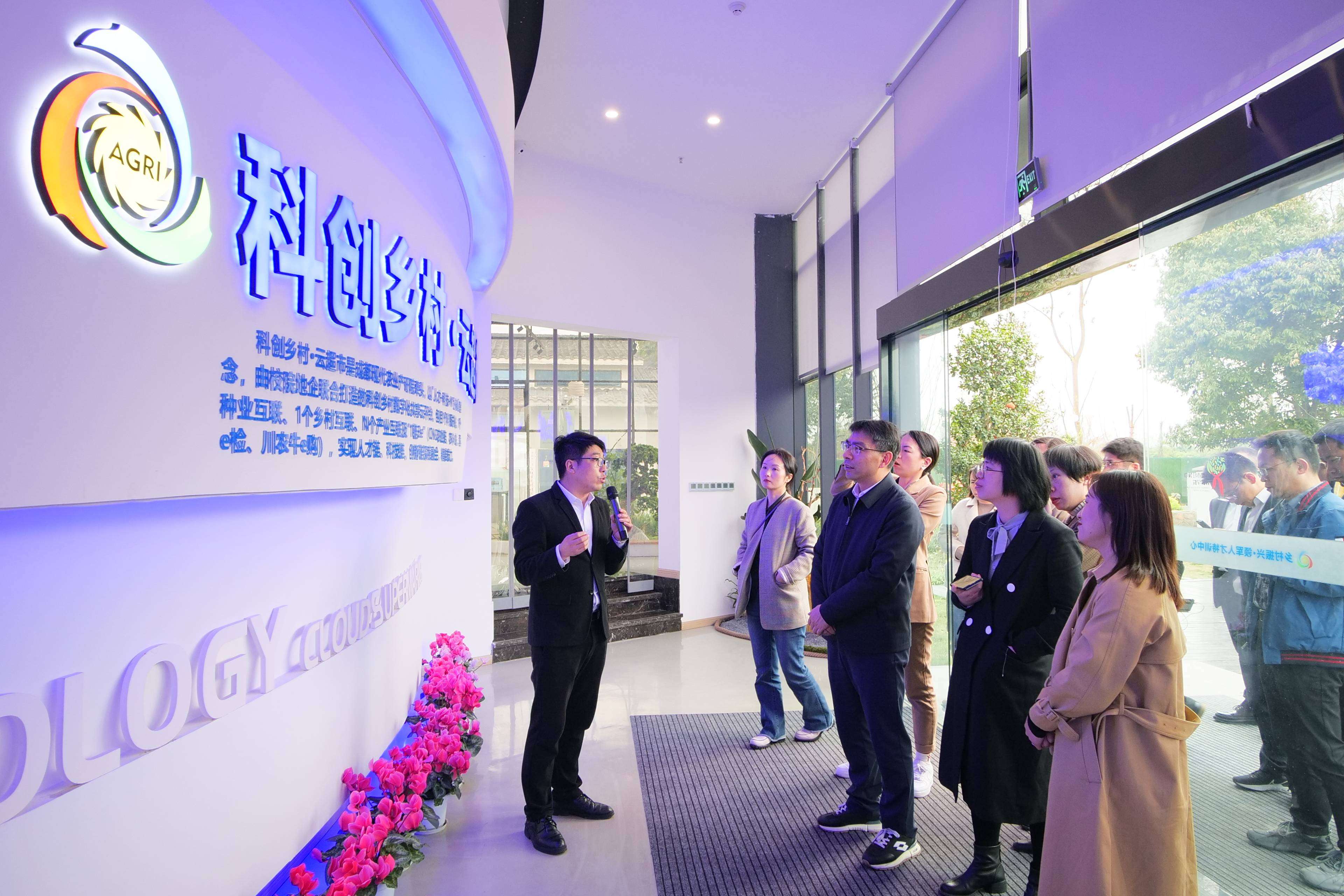 川农牛科创农庄负责人刘可成向考察团一行汇报了川农牛科创农庄联动万春镇高山村壮大村集体经济的模式,介绍了数字田园、科创乡村·云超市、科创云课堂、种业互联、云问诊中心等乡村振兴领军人才集成赋能系统。
