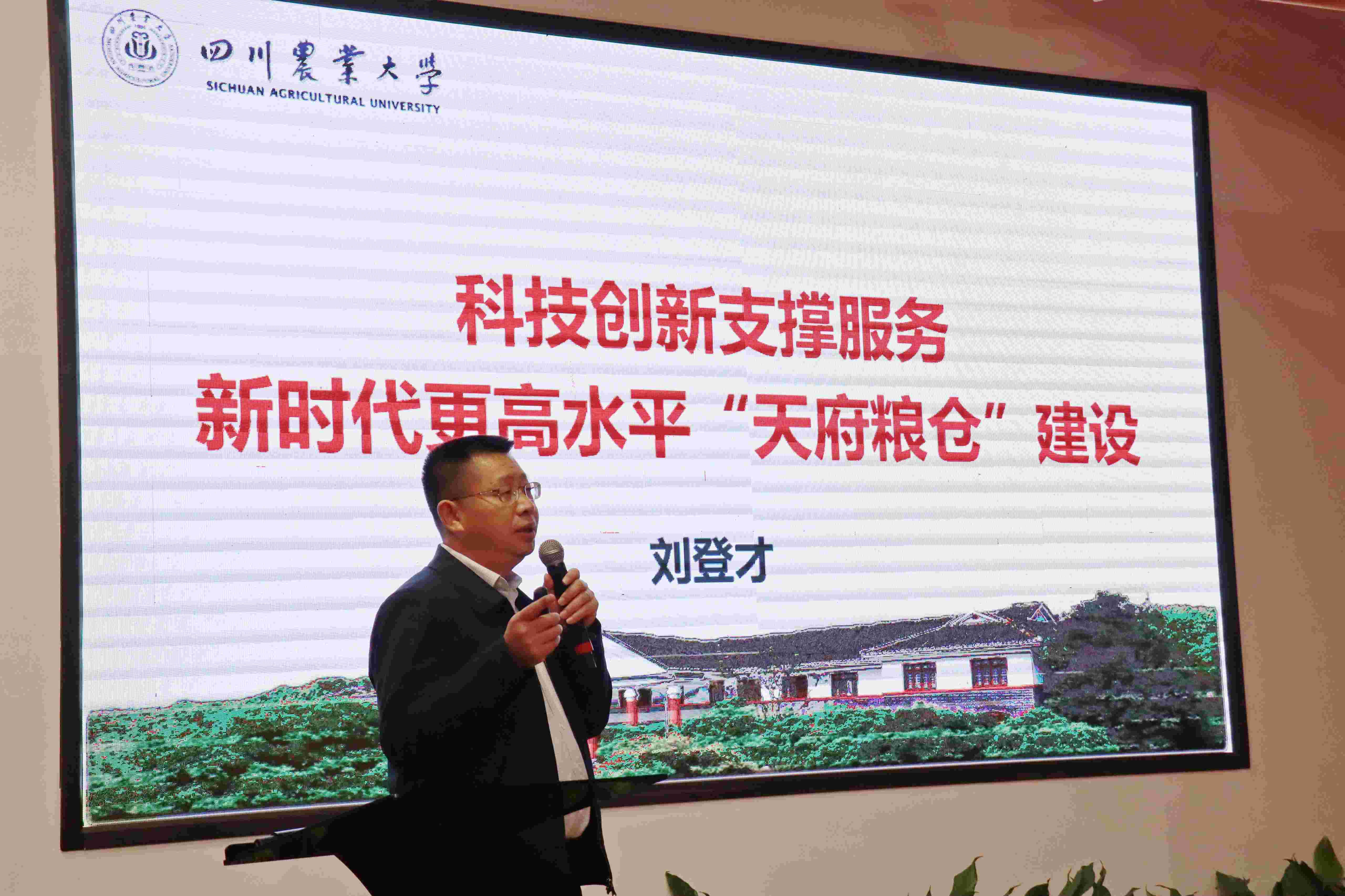 恳谈会结束后,与会嘉宾在一首悠扬婉转的《在希望的田野上》开启此次“天府粮仓”高质高效示范区与现代种业创新发展研讨交流活动。四川农业大学副校长刘登才做了以《科技创新支撑服务新时代更高水平“天府粮仓”建设》的主题分享,就学校基本情况和服务更高水平“天府粮仓”建设情况做简要介绍。学校在人才培养上学科门类齐全、育人体系完备;在科学研究上面向世界科技前沿、面向国家重大需求、面向现代农业建设主战场,创新引领,转化支撑,致力于“立地顶天”;在社会服务方面聚力于全力推进乡村振兴,服务于更高水平的“天府粮仓”、成渝双城经济圈、现代高效特色农业带建设等重大需求,持续打造西南地区社会服务新高地。以新时代问题为导向,面向多元主体,共建产学研融合平台,形成了横向联动、纵向贯通、多方协同的乡村振兴服务载体。