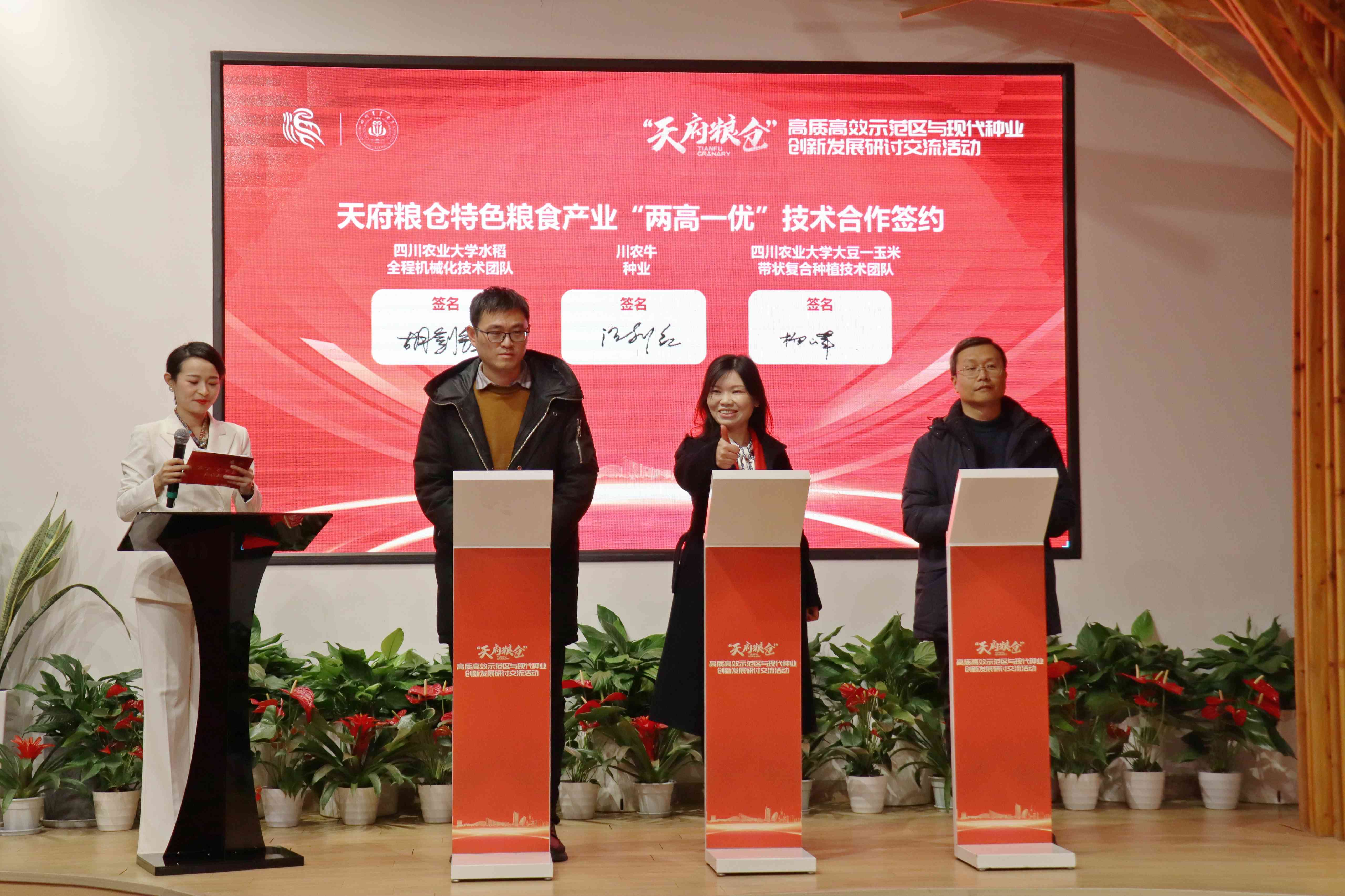 2月4日,由温江区农业农村局、四川农业大学乡村振兴研究院主办,成都都市现代农业产业技术研究院承办的“天府粮仓”高质高效示范区与现代种业创新发展研讨交流活动在川农牛科创农庄成功举办。本次活动以“‘种’出‘芯’希望 筑强新动能”为主题,聚焦现代种业和乡村振兴战略,邀请到四川农业大学、温江区委区政府、成都市农业农村局相关领导,以及四川农业大学水稻所、四川省食品发酵工业研究设计院、成都市农林科学院等涉农高校、科研院所、相关协会、企业代表等齐聚一堂开展研讨交流和现场签约。