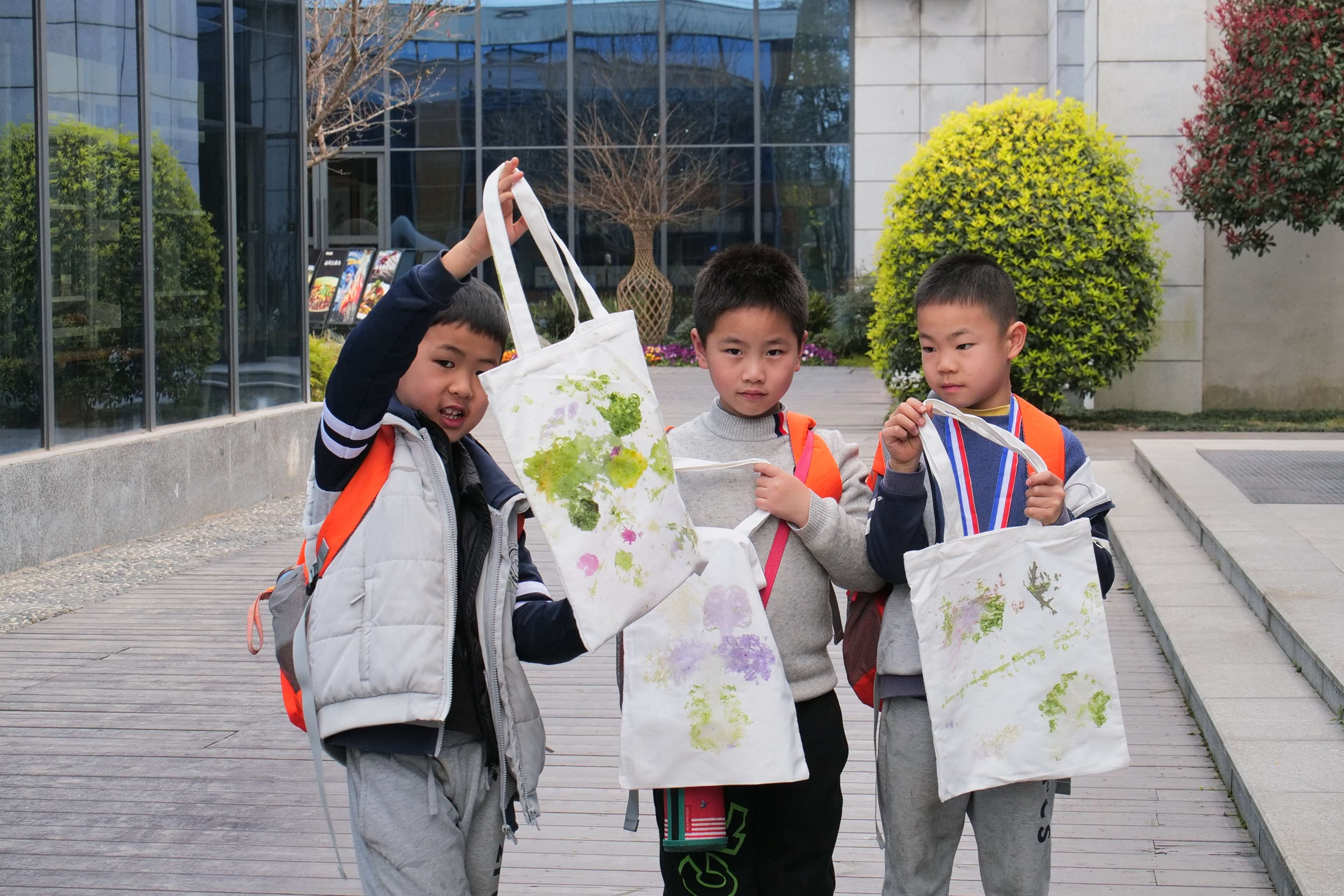 回到教室后,孩子们用小锤子反复敲打铺在帆布包上的植物,汁液与颜料交融渗透,拓印出独一无二的自然纹样。“我的包上有羽衣甘蓝的锯齿纹!”“看,油菜花的轮廓像小太阳!”孩子们兴奋地展示着自己的作品。这场植物拓印艺术课不仅锻炼了孩子们的动手能力,更让他们学会了用创意留存自然之美。
